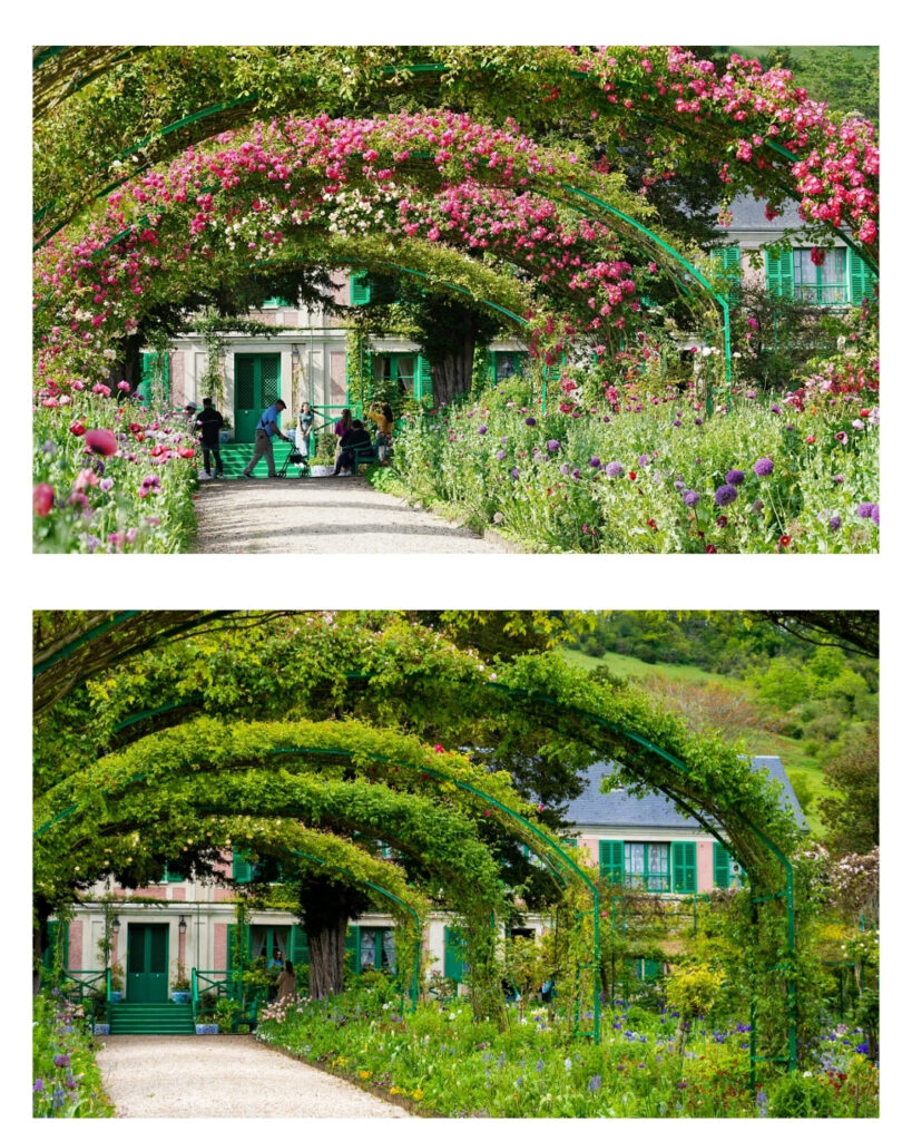 In its structure, the space recalls the layout of classical gardens, with a central path and perpendicular side alleys creating a series of shifting perspectives. Yet the floral composition breaks any sense of rigidity. Metal arches replaced part of the earlier vegetation, while an abundance of flowers — nasturtiums, roses, jonquils, tulips, daffodils, irises, oriental poppies, peonies, climbing roses, clematis, phlox, delphiniums, daisies, bellflowers, day lilies, marigolds, and sunflowers — unfolds across more than an acre in a palette that is both vibrant and meticulously orchestrated.