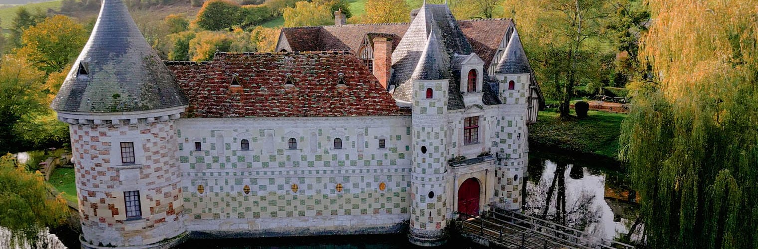 Jewel of the Pays d’Auge, near Lisieux, the castle combines a traditional 15th-century wooden mansion and a sixteenth-century varnished stone and brick building.